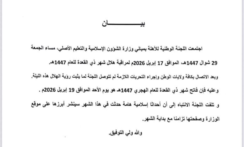 موجز_ أعلنت اللجنة الوطنية للأهلة أن يوم غد الأحد، الموافق للتاسع عشر من شهر أبريل الجاري، سيكون فاتح شهر ذي القعدة لعام 1447 هـ، وذلك بعد تعذر ثبوت رؤية الهلال مساء الجمعة.
