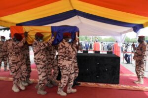 شيع في العاصمة التشادية نجامينا اليوم الجمعة23/04/2021 جثمان الرئيس التشادي “إدريس ديبي” الذي قتل في مواجهات مسلحة مع متمردين في منطقة كانم شمال غربي البلاد، وقبيل الجنازة عبر قادة مجموعة الساحل وفرنسا عن دعمهم العملية الانتقالية في البلاد عقب وفاة ديبي الذي تولى السلطة منذ 30 عاما.